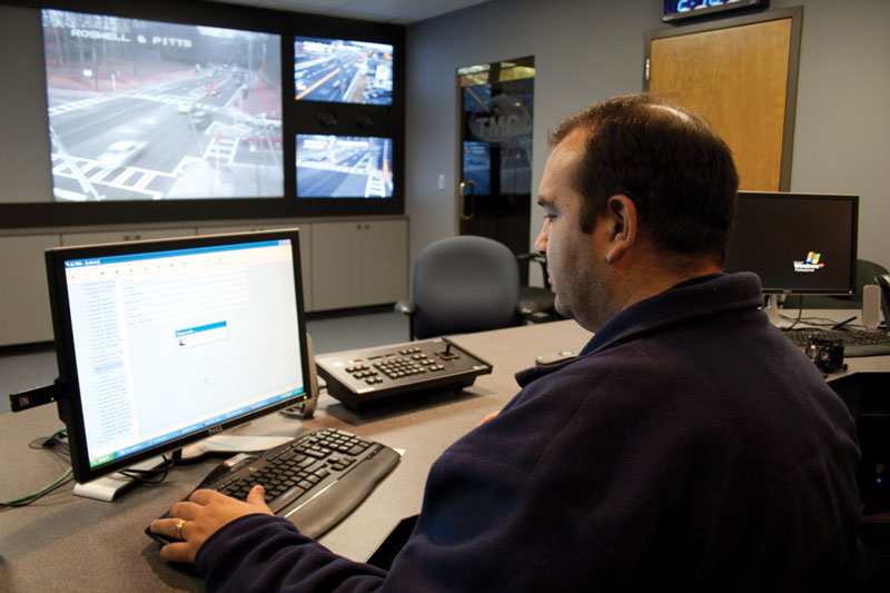 Waters and other staffers monitor the streaming video in the TMC on six screens — two 90-inch, rear-projection screens and four 42-inch liquid-crystal-display screens — that display the live camera feed from Roswell Road. Staffers sit at a desk with two computers and a telephone.