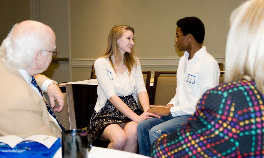 North Springs Charter High School students Mary Malloy and Chris Davidson perform a scene from “The Producers” for members of the Sandy Springs/Perimeter Chamber of Commerce during the chamber’s meeting March 15. Watching are chamber board member Bob Shaw, at left, and board chair Debra Goldman, at right. Performing arts students will present the play March 19,20,21, 25, 26 and 27 at 7:30 p.m. and March 20 and 27 at 2 p.m. Tickets are $10 for adults and $8 for students and senior citizens.