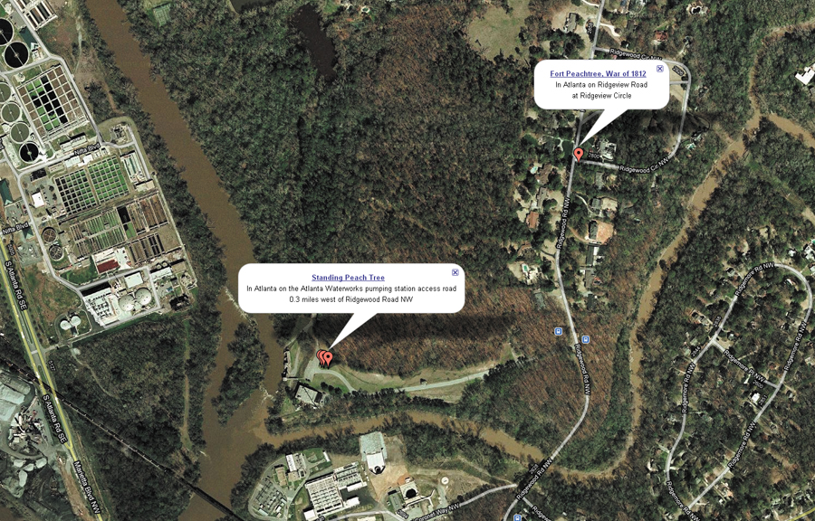 So much of Atlanta’s history is tied to this particular spot that it is a shame it cannot be visited. City officials may one day figure out a way to make it available to the public again. Until then, the former location of Standing Peachtree can only be glimpsed by looking north along the Chattahoochee River as one drives over the bridge on South Atlanta Road.