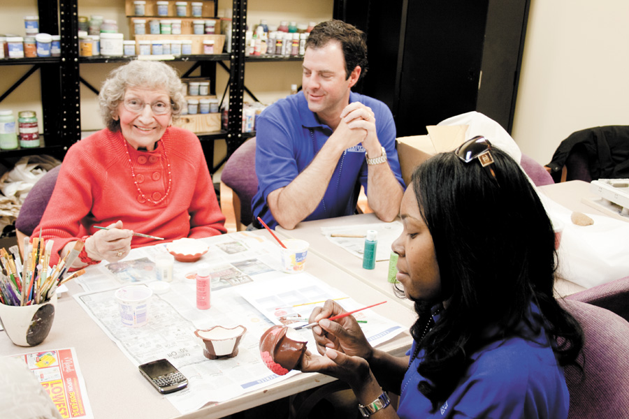 Sandy Springs senior Barbara Lancaster (at left) paints a clay sculpture with help from the city’s Deputy Director of Community Development Chris Miller and Trinita Patton with Northside Hospital.