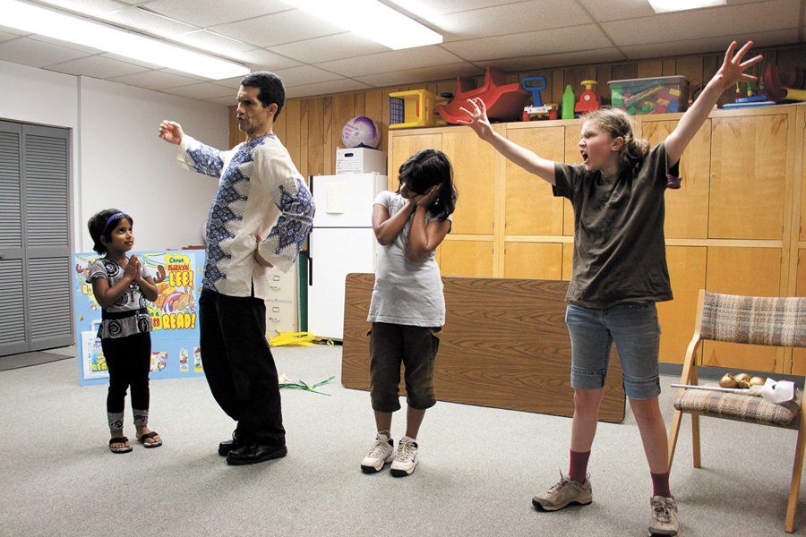 Jeanie played Icarus and flew around the room with Mann. Both carried sticks with yellow feathers. “Wee, I can fly,” said the young girl with pigtails, until Mann explained that Icarus lost his wings after the wax melted when he flew close to the sun.