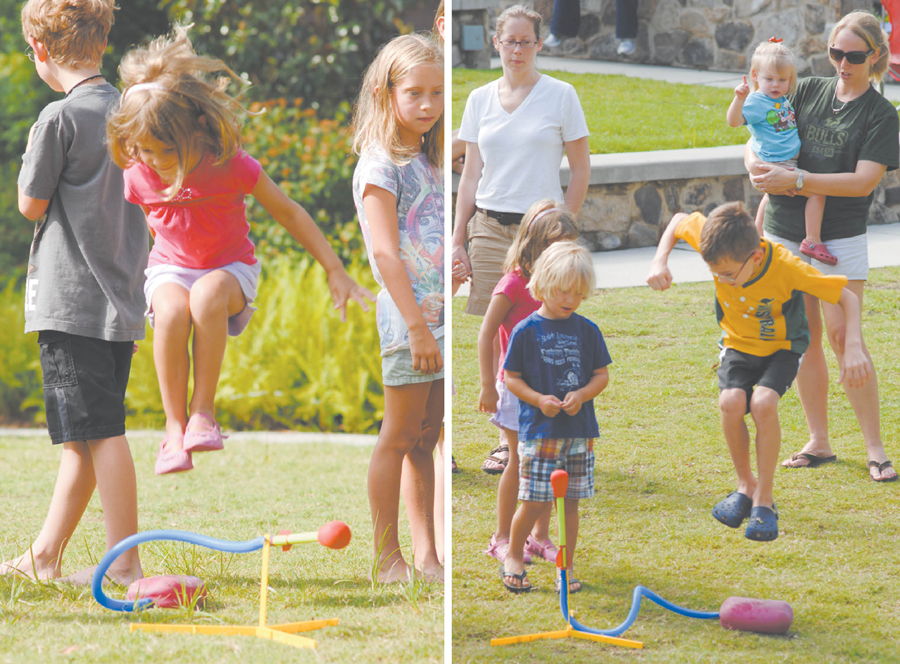 3-2-1 Blast Off, sponsored by Heritage Sandy Springs as part of its Movin’ Groovin’ Mornings series, showed kids a little bit about the high-flying science of rocketry. Above, Jason Harvey, 8, takes a vigorously two-footed approach to activating his launch pad. At left, Reese Peddle, 4, shows she also can go ballistic with the best of them.