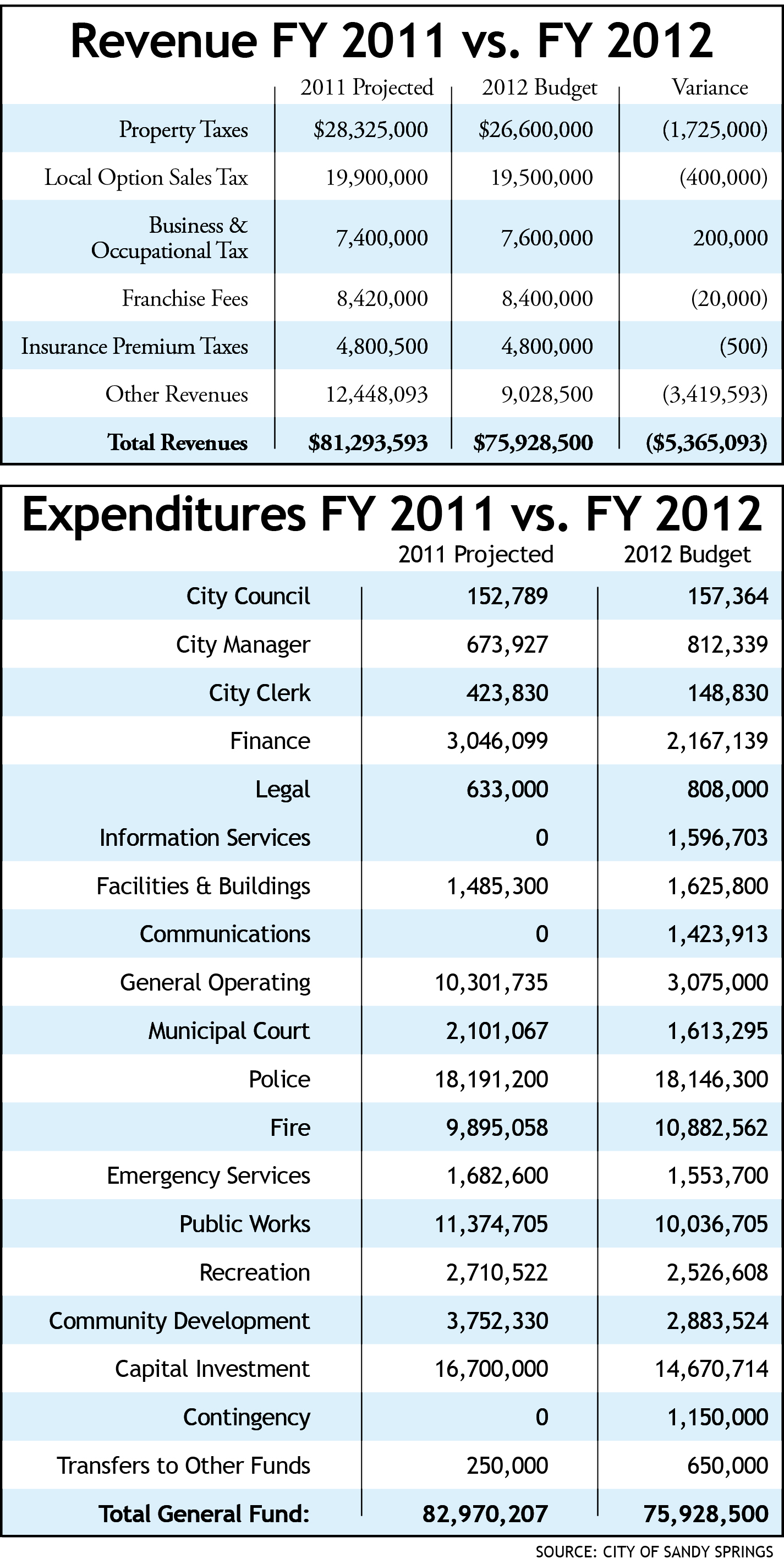 Sandy Springs city officials anticipate a $5.4 million drop in revenues next year and expect to cut spending by about $7 million, according to budget figures released during a City Council workshop.