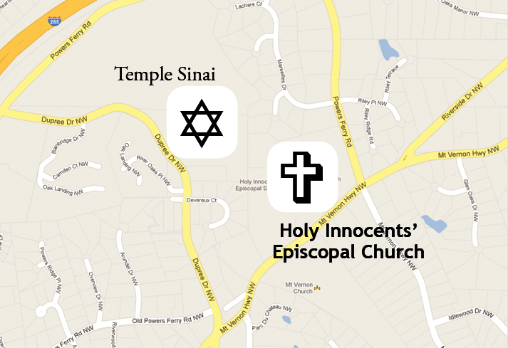 This Christmas, members of Holy Innocents’ Episcopal Church will celebrate the birth of their savior at Temple Sinai, a Jewish synagogue that’s literally Holy Innocents’ next door neighbor.