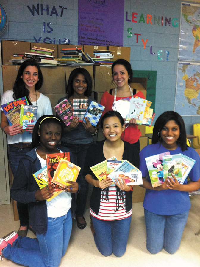 Front, from left, Alima Sore, Kayla Feng and Tyra Blackmon, with, back row, Katie Tanenbaum, Roni Blackman and Julia Kessler, all Invisible Children Club members at Riverwood International Charter High School in Sandy Springs, collected 7,000 books to support charitable causes.