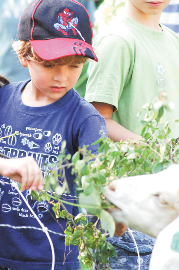 Grant Bailey, 5, gives one sheep a snack, while Audrey Hamilton, 4, right, checks out the “laborers.”