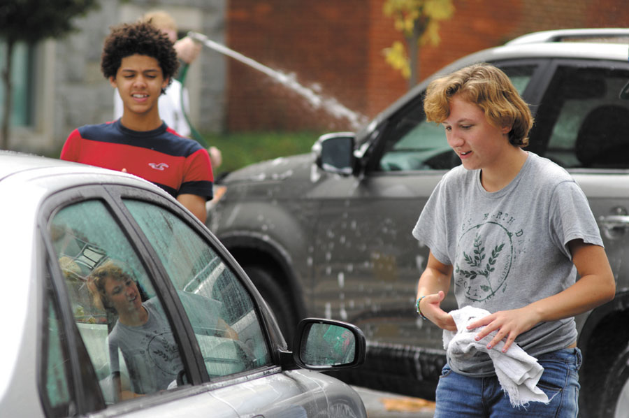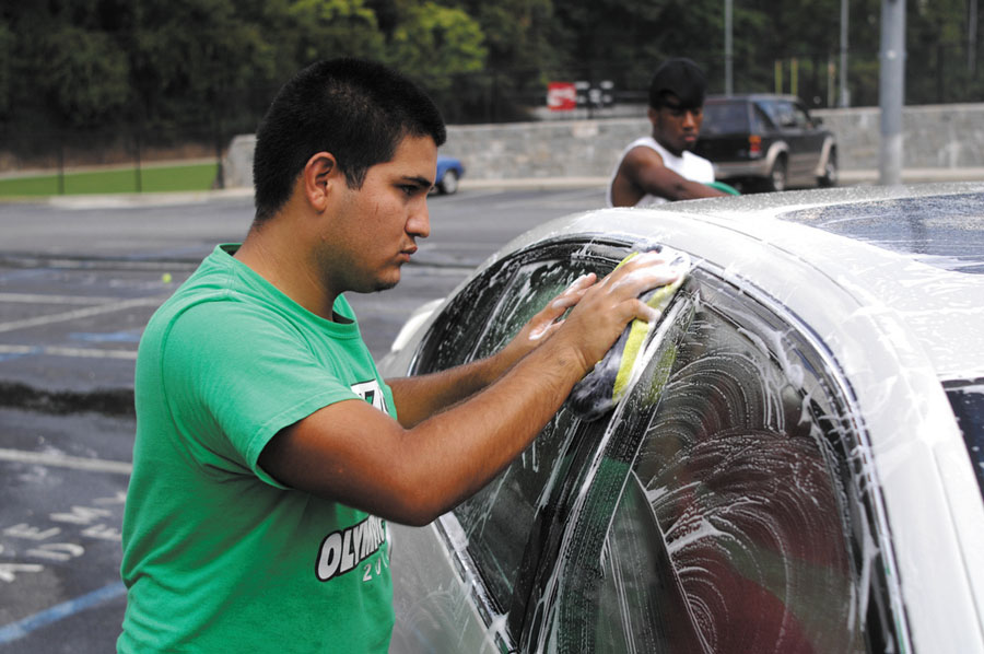 Sophomore Julio Diaz, front, gets hosed, and freshman Josh Jones fully enjoys the moment during a car wash fundraiser at North Atlanta High School in Buckhead on Sept. 15. Students raised $383, with half of the proceeds going to the school’s JROTC program and the rest distributed to local nonprofits.