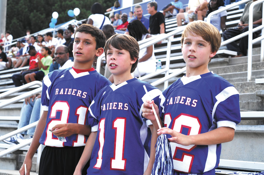 From left, Davis Herndon, Alex Grudnig and Harris Beckley, all sixth graders at Ridgeview Middle School, keep their eyes focused on the field as they follow the excitement at Riverwood International Charter School’s football game against Holy Innocents’ Episcopal School on