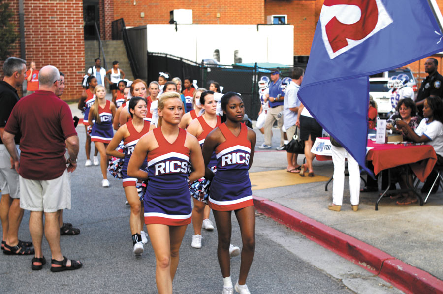 Raiders varsity cheerleaders lead the procession through the stands before the game.