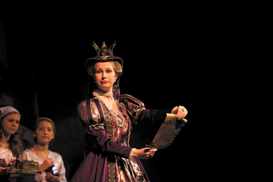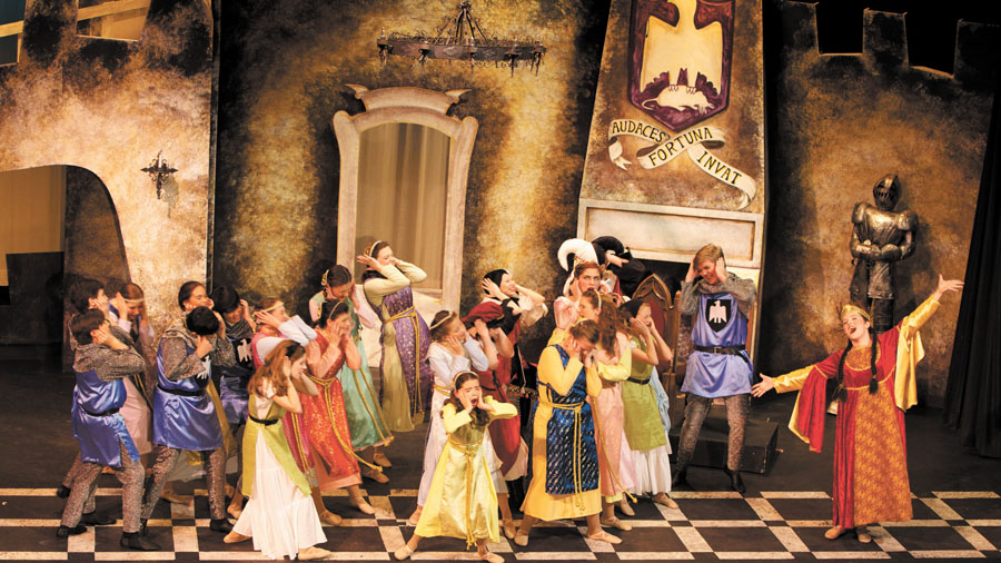 Senior Laura Sullivan portrays “Queen Aggravain.” Above, senior Payton Anderson, far right, as “Princess Winnifred,” sings “Shy,” while the chorus responds to her vocals.