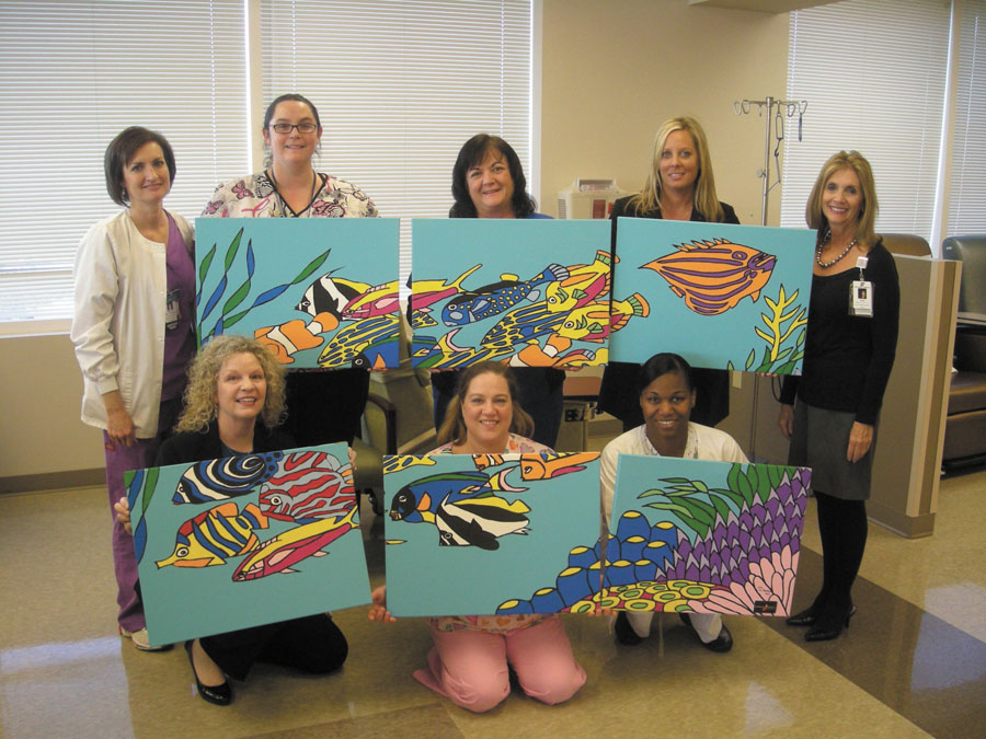 Front row, from left, Annette Curtiss, GE Healthcare, nurses Christy Bigwood and Monica Mills, with, back row, from left, nurses Claire Russo, Emily Combs and Lori Hall, Karyn Posey, GE Healthcare, and Susan Casella, Northside Hospital, show off colorful artwork created by art supplies purchased by GE through the Foundation for Hospital Art organization.