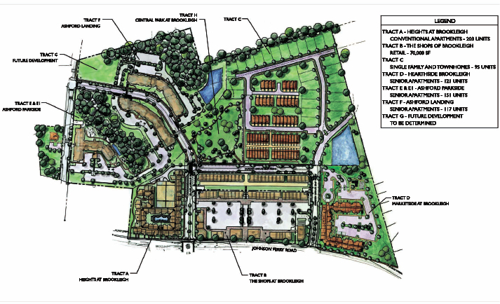 The Housing Authority of DeKalb County is re-developing the property through a partnership with The Norsouth Companies and The Collaborative Firm. Brookleigh, the former site of the Johnson Ferry East housing project, is to include senior apartments, townhomes, a park and retail.
