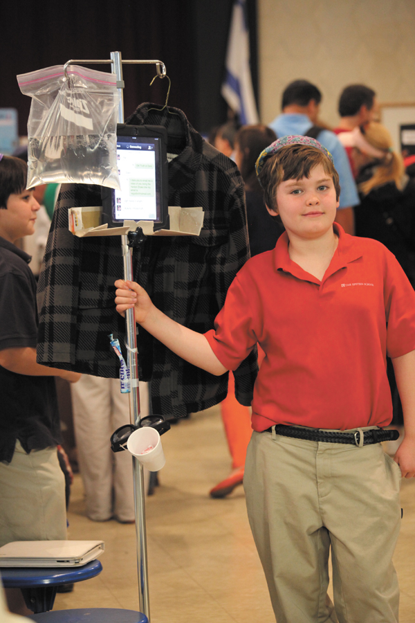 Caleb Heller devised a lighted telescope for stargazing at night, as fourth graders imagined new devices for The Epstein School’s annual Invention Fair on April 26.
