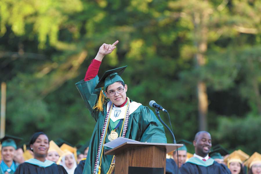 Valedictorian Ranulfo Santos entertains his classmates while at the podium.