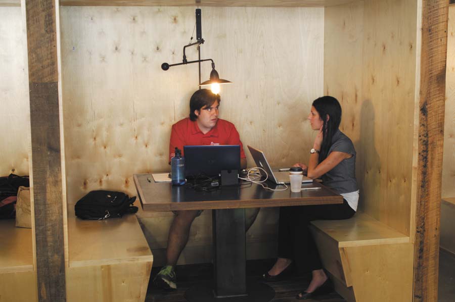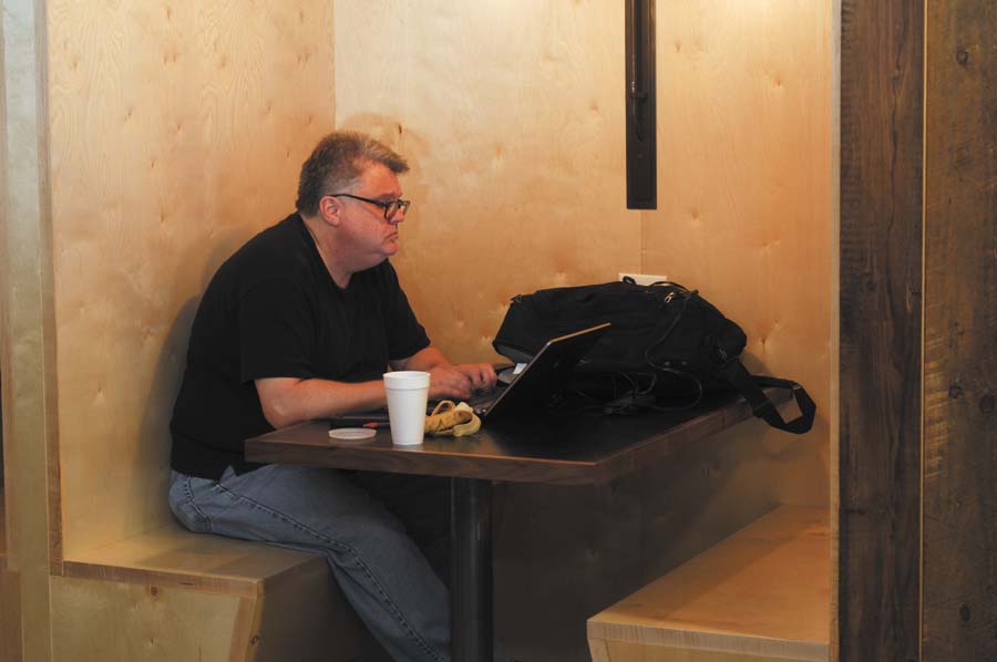 Now he can do his job from his virtual office. One recent afternoon, he was hard at work in a booth next to the one Sanchez, the engineer, was using as his office and just a couple of dozen feet from the one where Miller was interviewing clients. And, of course, he was just a quick walk from Roam’s in-house coffee shop.