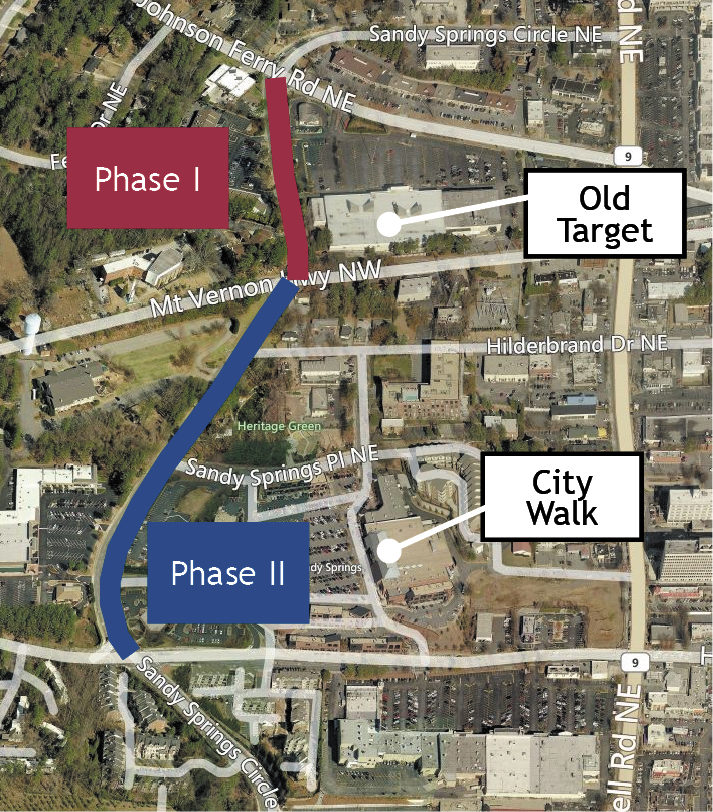 City officials announced that Sandy Springs Circle Streetscape will now consist of two phases. The first phase will be focused on the section of the road from Mount Vernon Highway to Johnson Ferry Road, which abuts Sandy Springs’ future city center. The second phase, which isn’t fully funded, will complete the stretch from Mount Vernon south to Hammond Drive.