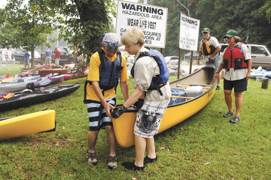 Boy Scout Troop 463 members Eli McDaniel, left, and Eric Schank, right, help put boats in the water.