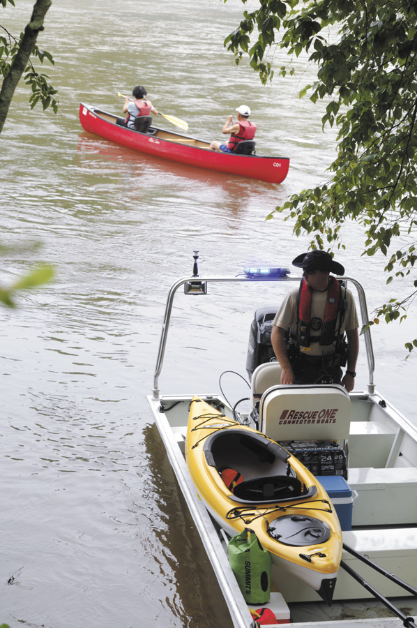 Sandy Springs Police Officer Chris Caudell mans the department’s river rescue boat.
