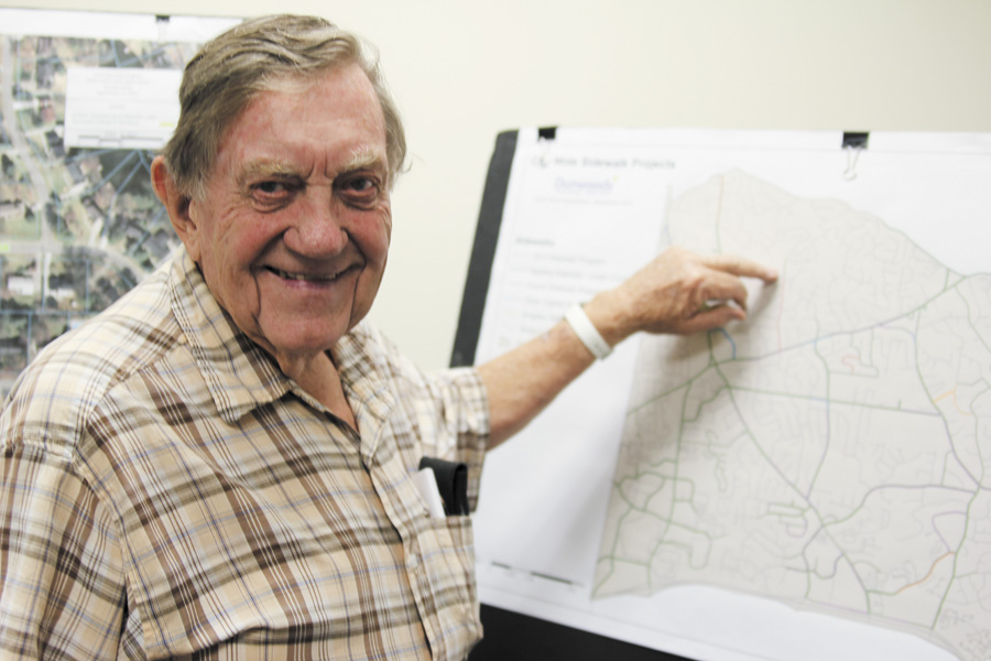 “I’ve got a big mailbox. I’m hoping they don’t tear it down,” he said as he found his home on a large aerial photograph of Mount Vernon Way on which city officials had marked the location of the planned sidewalk. “They said they don’t think they will.”