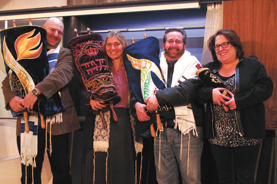 Photo by Phil Mosier Sunday February 17, 2013 Placing the Torah in its new permanent home. (It was at the Weber School while new location was under construction.) Left to right: Rabbi Mario Karpuj, and Rabbi Analia Bortz, current President Fred Wachter, and past President Betsy Edelman.