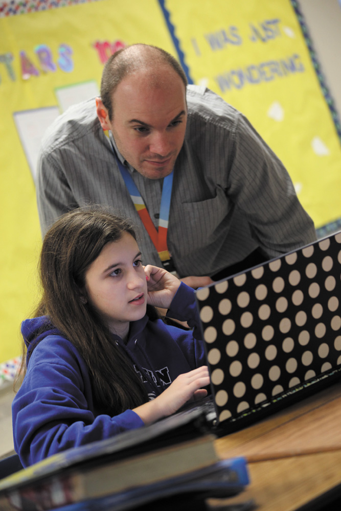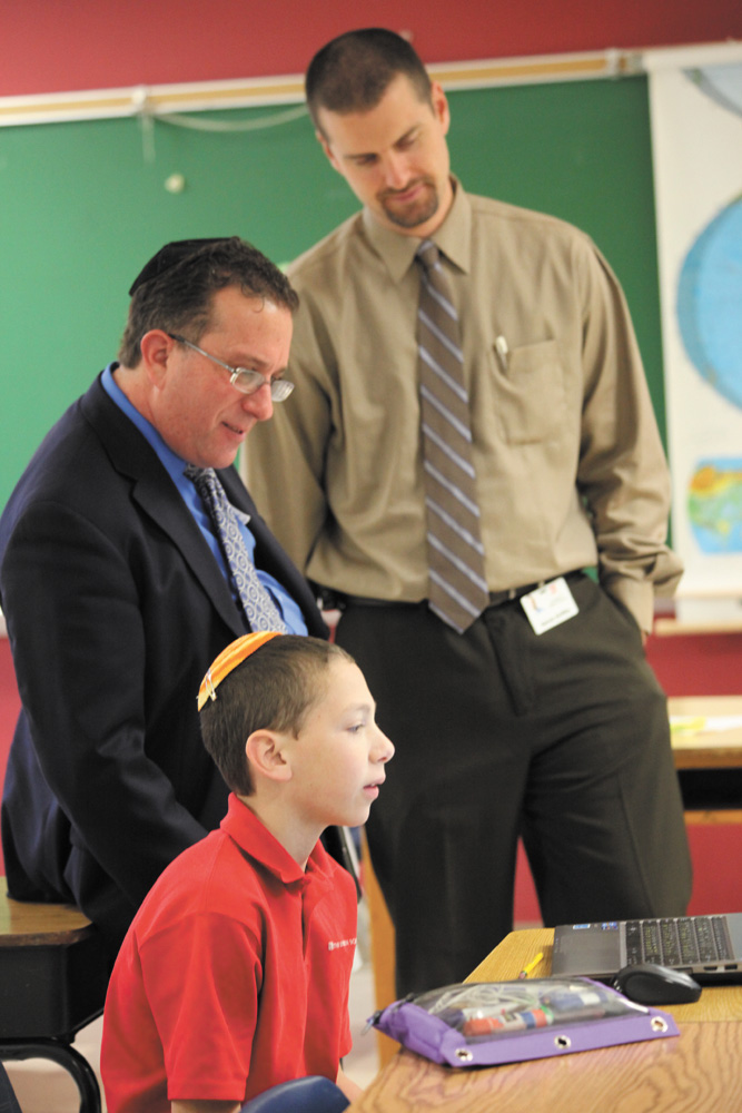 Student Sean Lewis is at the computer while Gary Hartsein, director of DigitalJLearning Network, left, and Aaron Griffin, right, the school’s principal of Digital Learning and Technology, look on during Hartsein’s recent visit to the school.