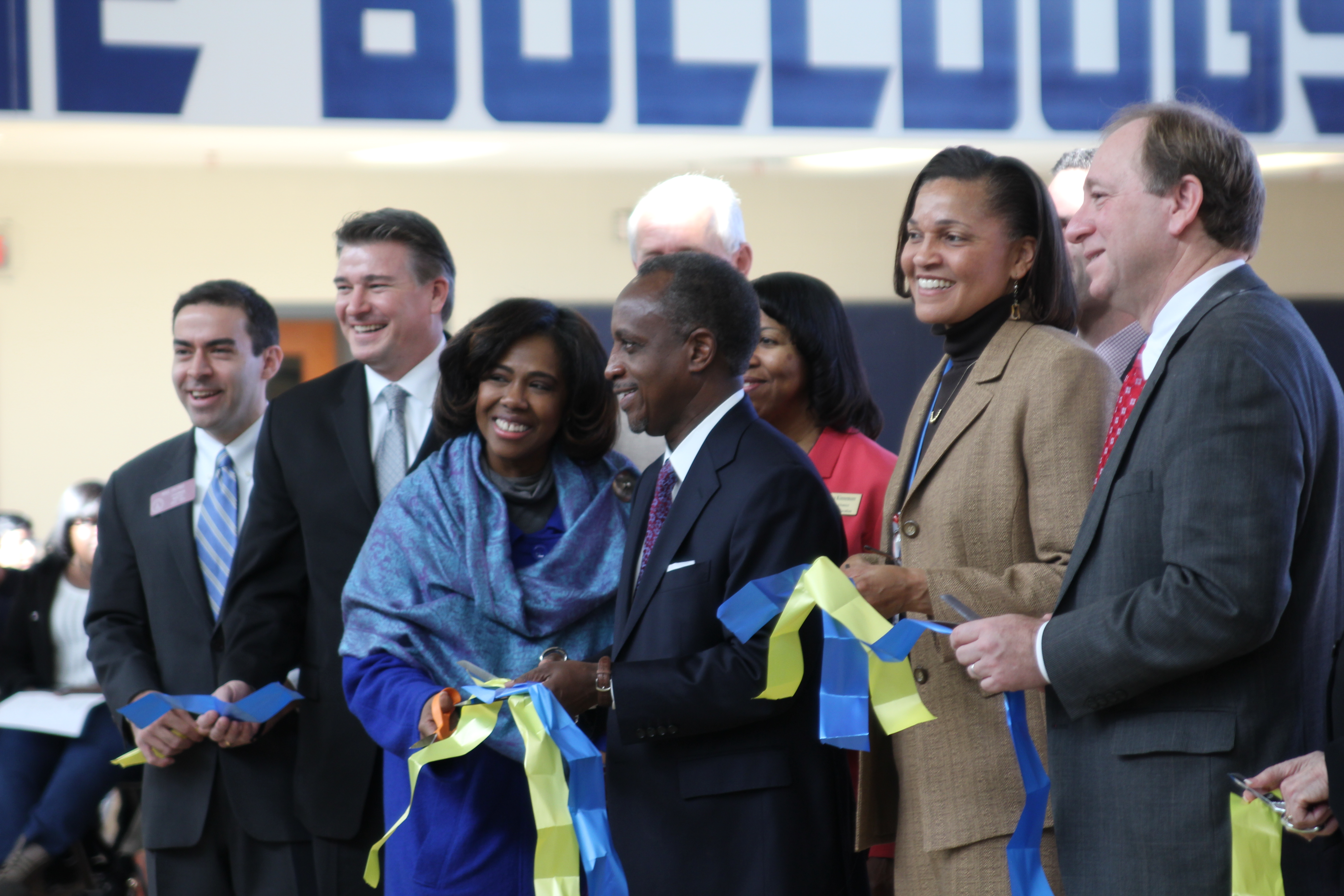 From left: State Rep. Mike Jacobs, R-Brookhaven, Chamblee Mayor Eric Clarkson, DeKalb County Board of Education Member Karen Carter, DeKalb County Schools Superintendent Michael Thurmond, Chamblee Charter High School Principal Rochelle Lowery, and DeKalb County Board of Education Member Marshall Orson cut a ribbon to mark the opening of the new school building for Chamblee Charter High School Jan. 22