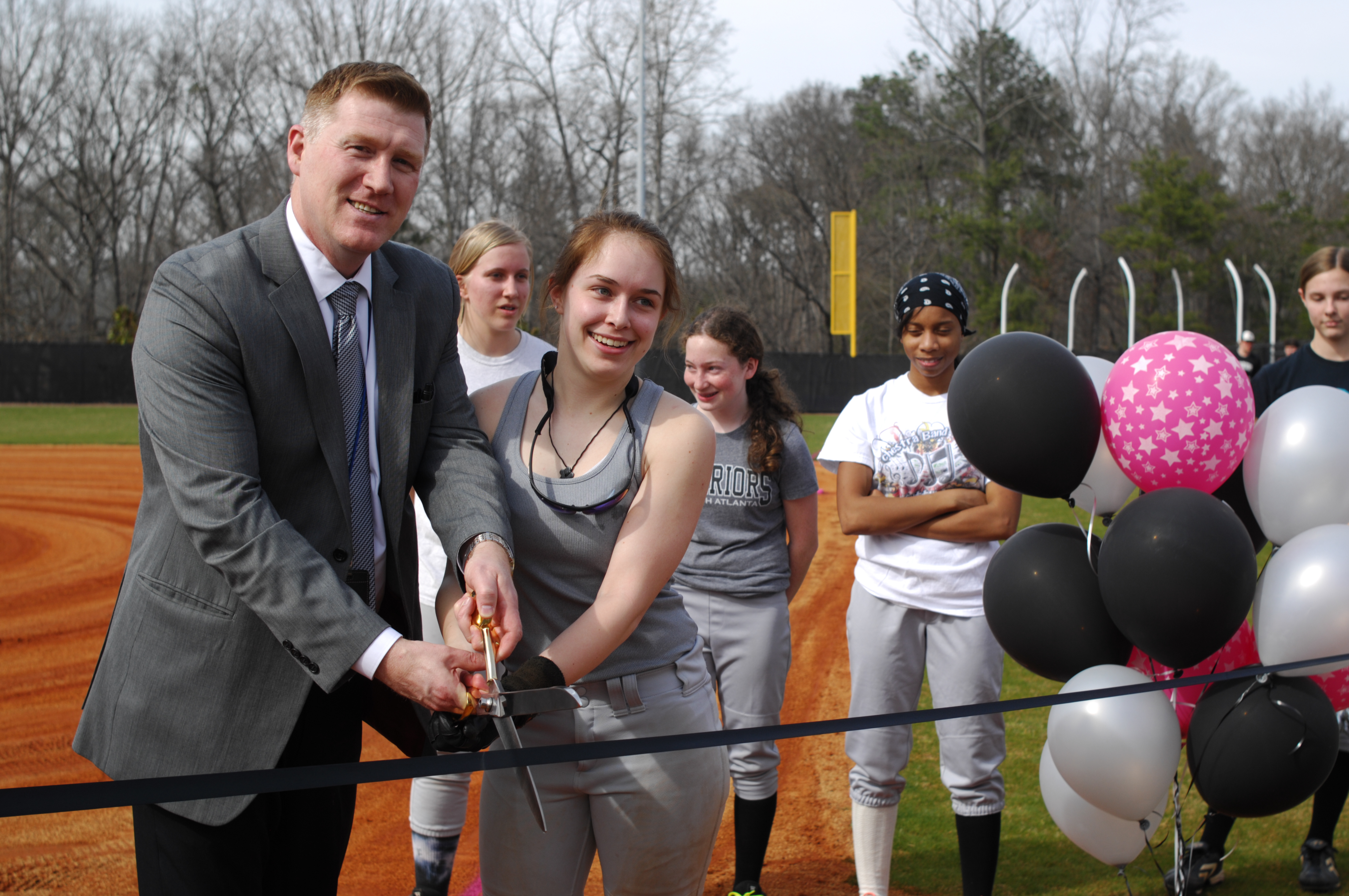 Gene Taylor, principal of North Atlanta High School, cuts the ribbon March 21 on a new softball field at the school. The new field opened with an exhibition game by co-ed teams composed of players from the high school girls softball team and boys junior varsity  baseball team.