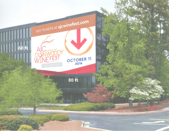 Dunwoody City Council on July 14 was presented a request for a sign that big to announce the planned AJC Dunwoody Wine Fest. The Atlanta Journal Constitution proposes hanging a vinyl banner that is 60 feet tall and 80 feet wide on the side of its building at 223 Perimeter Center Parkway.