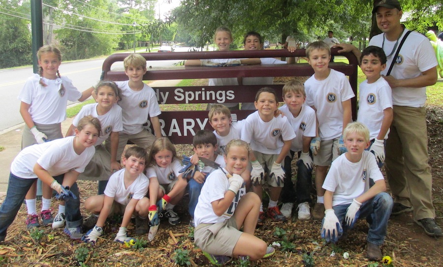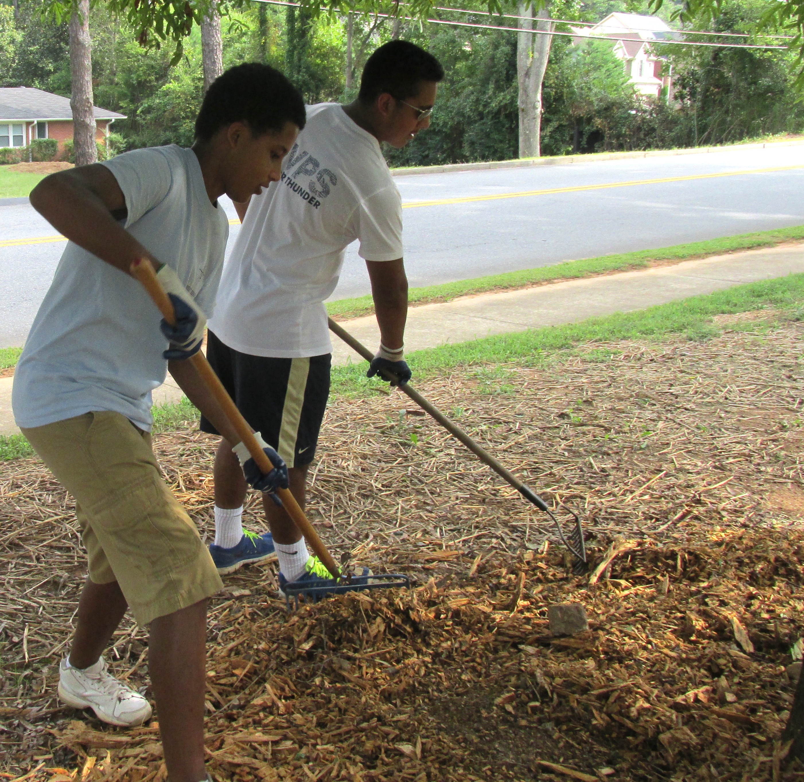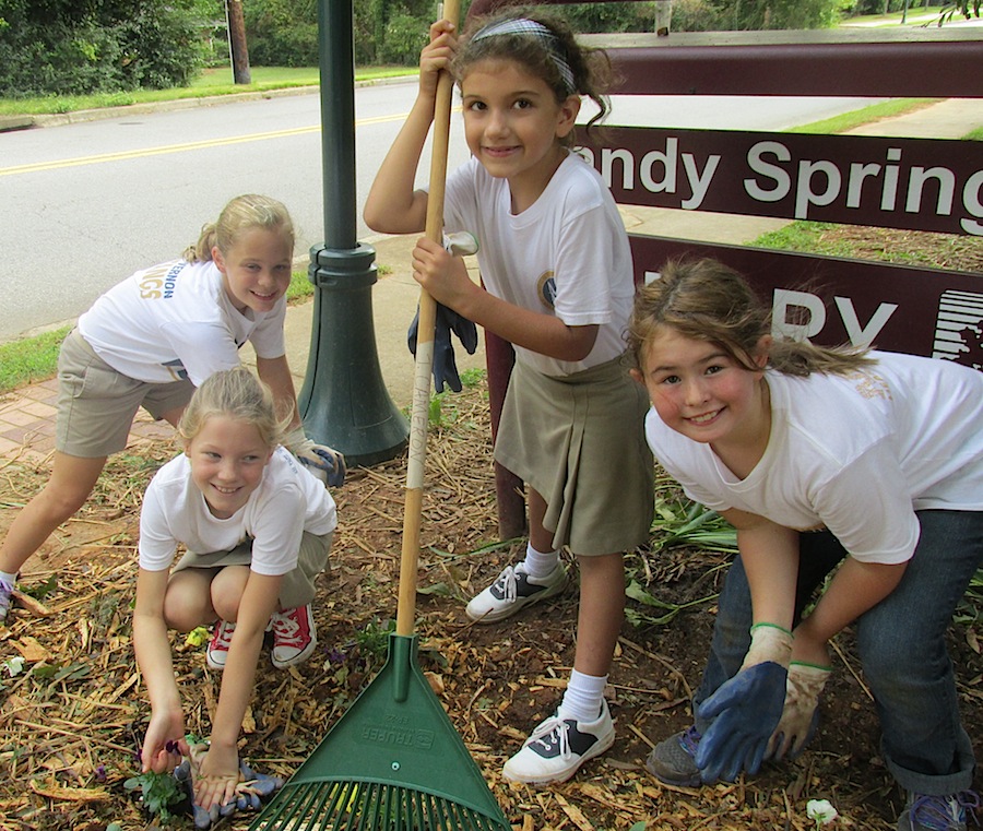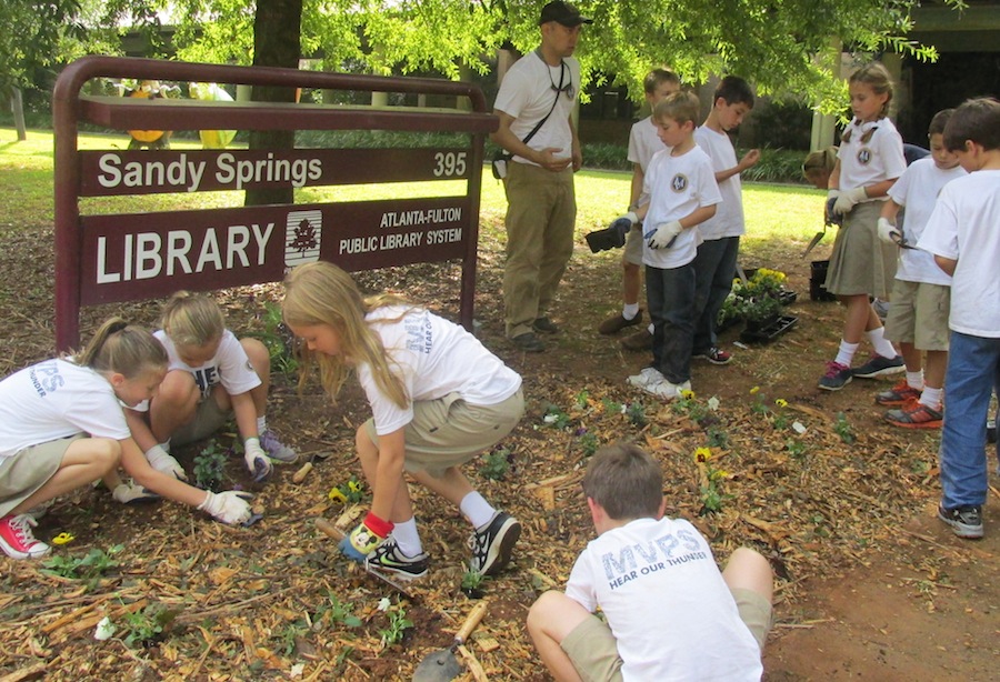 Dozens of students from Mount Vernon Presbyterian School honored the Sept. 11 National Day of Service by volunteering at the Sandy Springs Library. Students planted flowers, pulled weeds and hauled and layed down mulch. Their efforts were organized by Sandy Springs resident Sylvia McAdams, who is working to improve the library’s grounds following cuts in services.