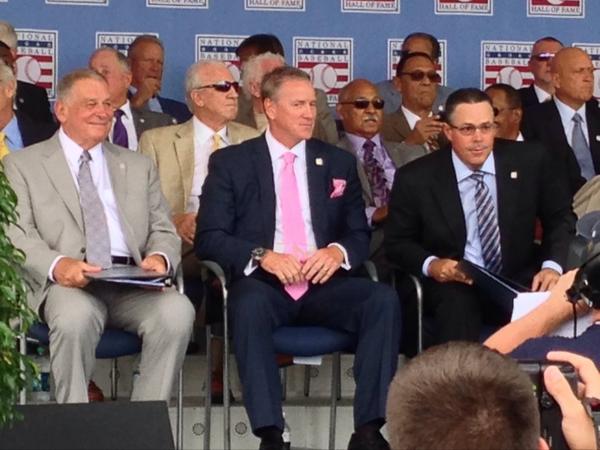 From left, Bobby Cox, Tom Glavine and Greg Maddux are inducted into the Baseball Hall of Fame. (Courtesy CBS46)