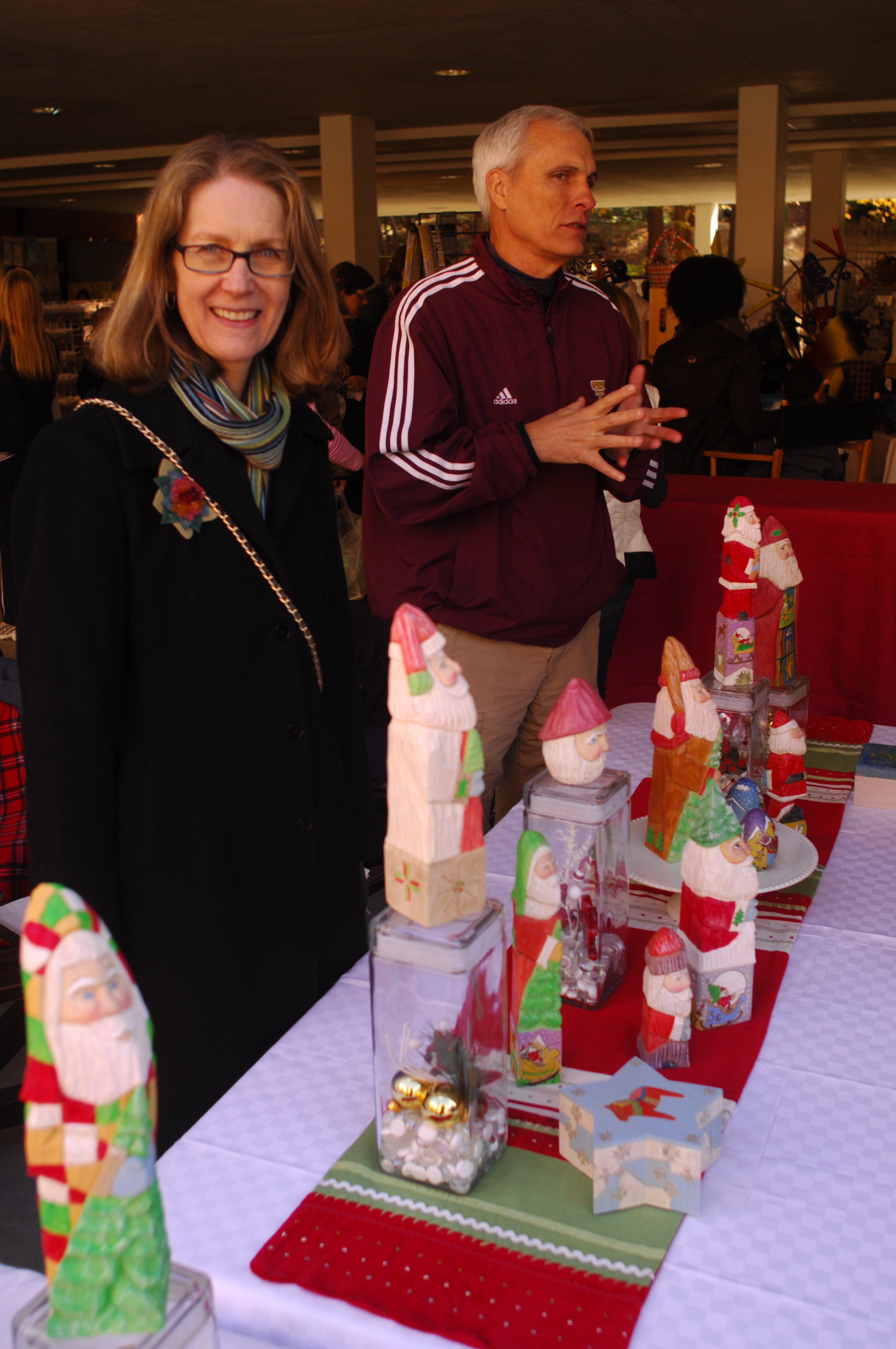 At left, Neal Walters and his granddaughters, Emerson, 6, and Maria, 4, take a break from early holiday shopping at the Marist School’s annual “Holiday Traditions” market. The juried arts and crafts show is sponsored by the Marist School Parents Club. Below, artist Michael Harwell and his wife, Linnea, sells his carved Christmas characters.