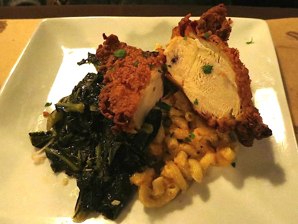 For entrees, we ordered the fried chicken, the meatloaf and the Fez burger. The chicken was hot and crispy; the meat moist and tender. The accompanying mac ‘n cheese had a smoky Gouda taste and the mojo collard greens were spicy, but a bit too vinegary. The meatloaf with tomato jam had good flavor but was dry, as if it had lingered under a heat lamp. The accompanying Parmesan mashed potatoes affirmed my hunch, as they had the consistency of spackling compound.