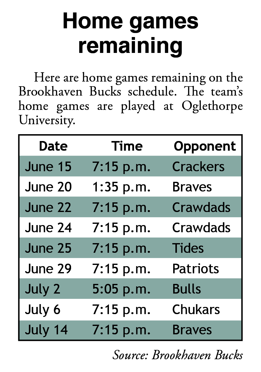 The Bucks play their home games at Oglethorpe University. The season opened June 1 and is to continue through mid-July. Tickets cost $5 for adults and $3 for children. The team’s schedule can be found at the team’s website, brookhavenbucks.com.