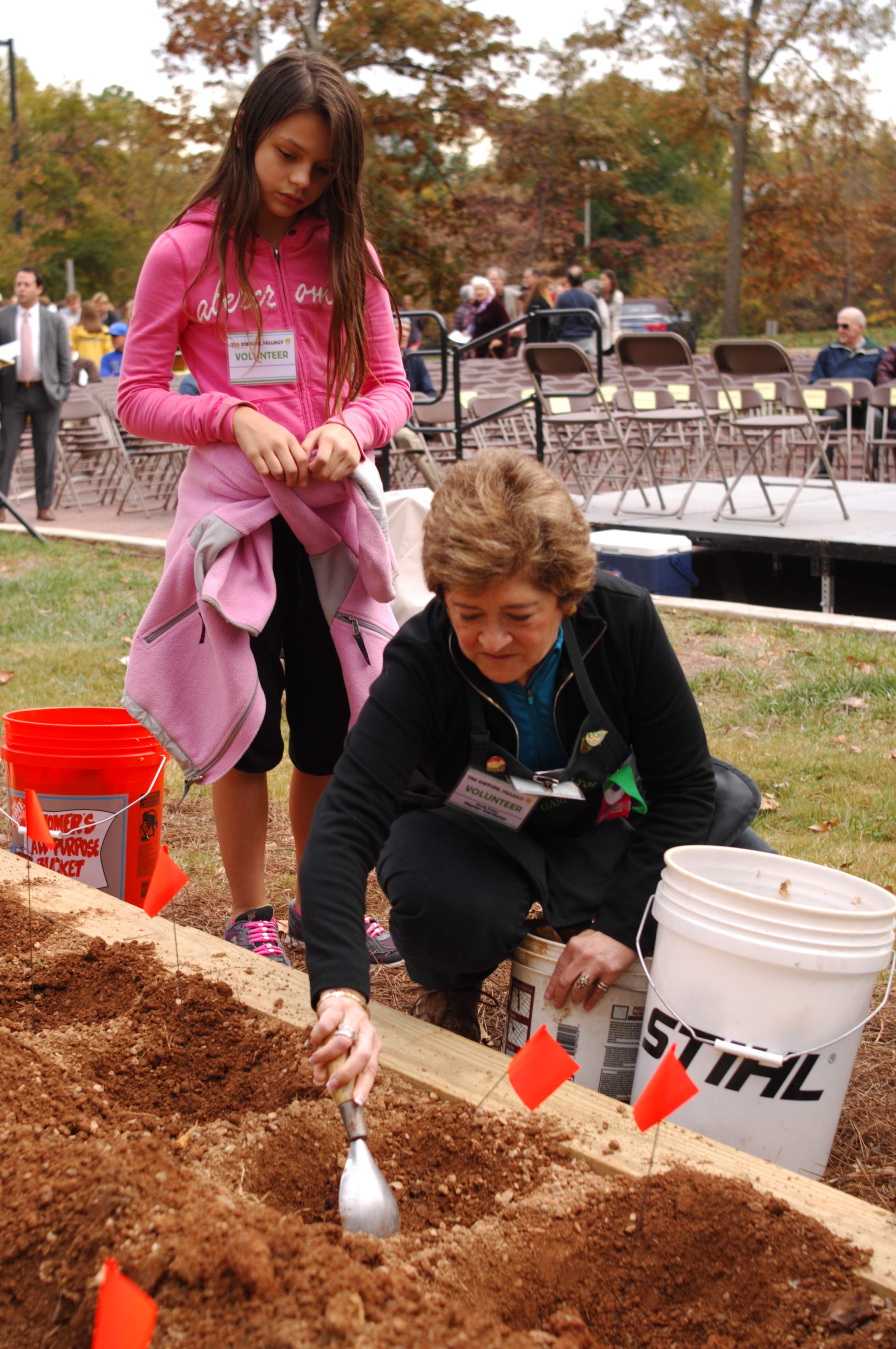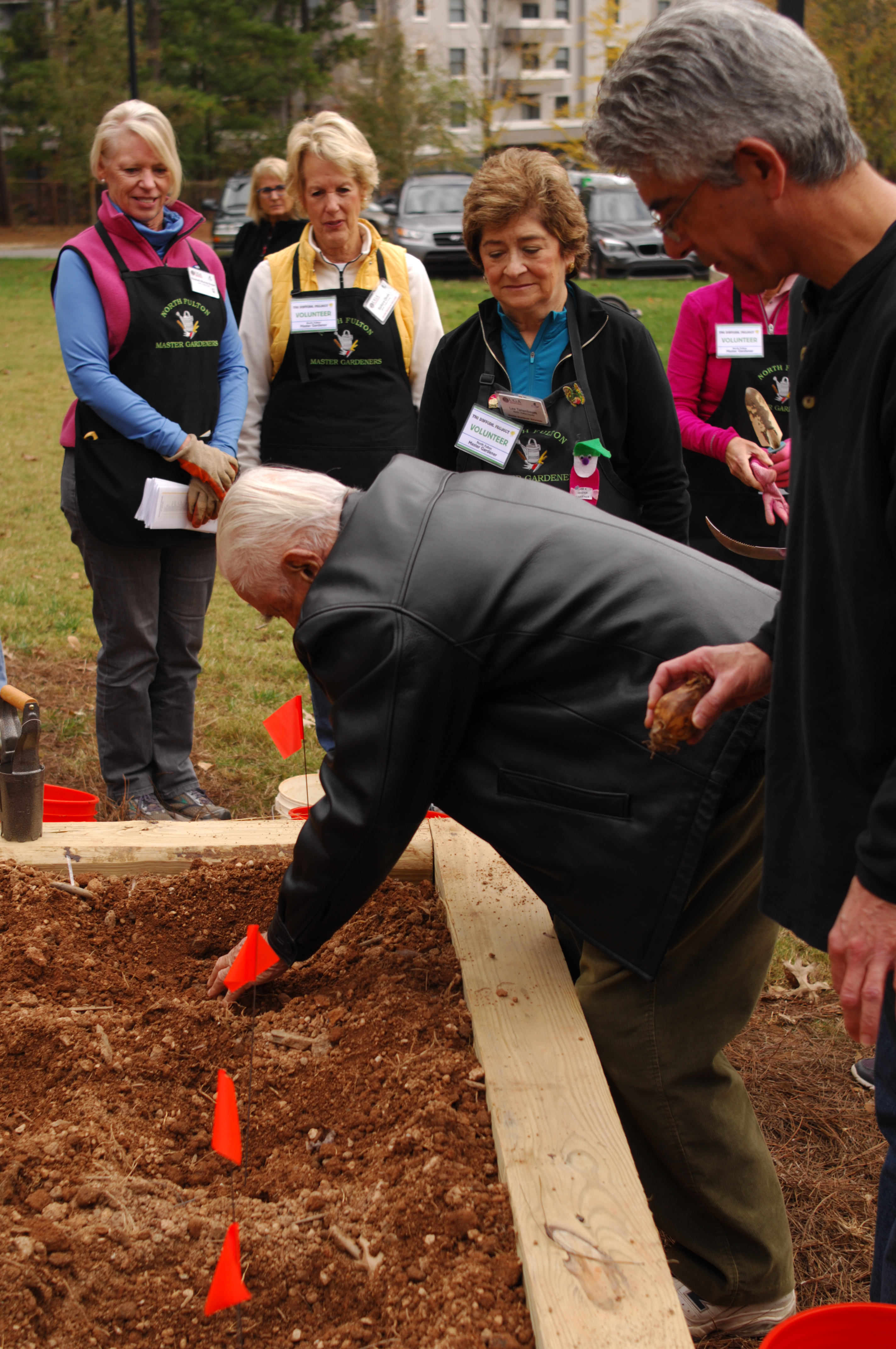 Many guests line up to plant bulbs at the Daffodil Project Children’s Memorial Garden at Hammond Park Nov. 15. (Photo by Phil Mosier)Gardeners Club members (left) Jayden Erickson, 10, and Lee Tanenbaum prepare the soil at the Daffodil Project Children’s Memorial Garden at Hammond Park Nov. 15. (Photo by Phil Mosier)Dr. John Galambos (center), husband of Sandy Springs’ first mayor, the late Eva Galambos, and their son Michael (right) plant the first bulb at the Daffodil Project Children’s Memorial Garden at Hammond Park Nov. 15. (Photo by Phil Mosier)