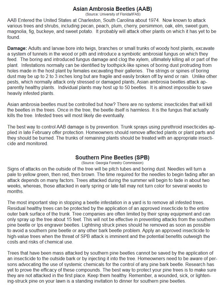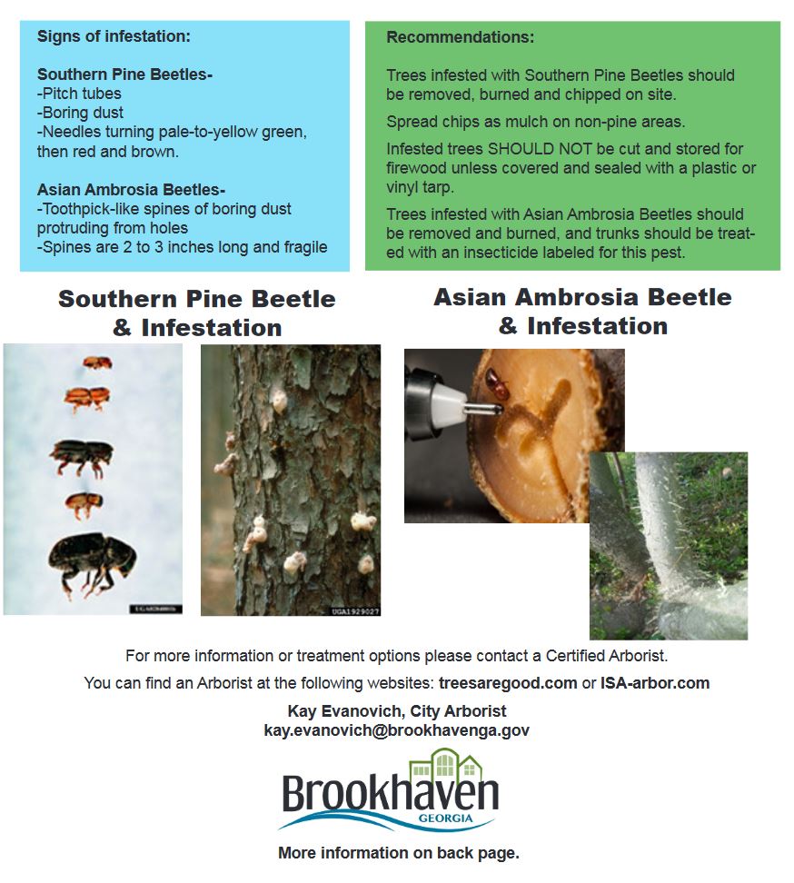 Brookhaven’s arborist is asking residents to be on the lookout for pine and ambrosia beetles, both dangerous to trees.