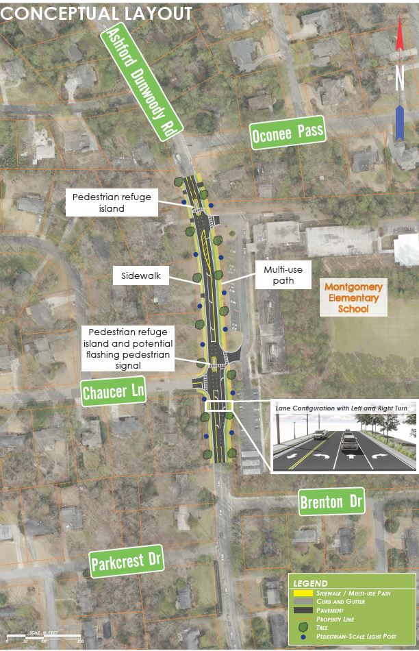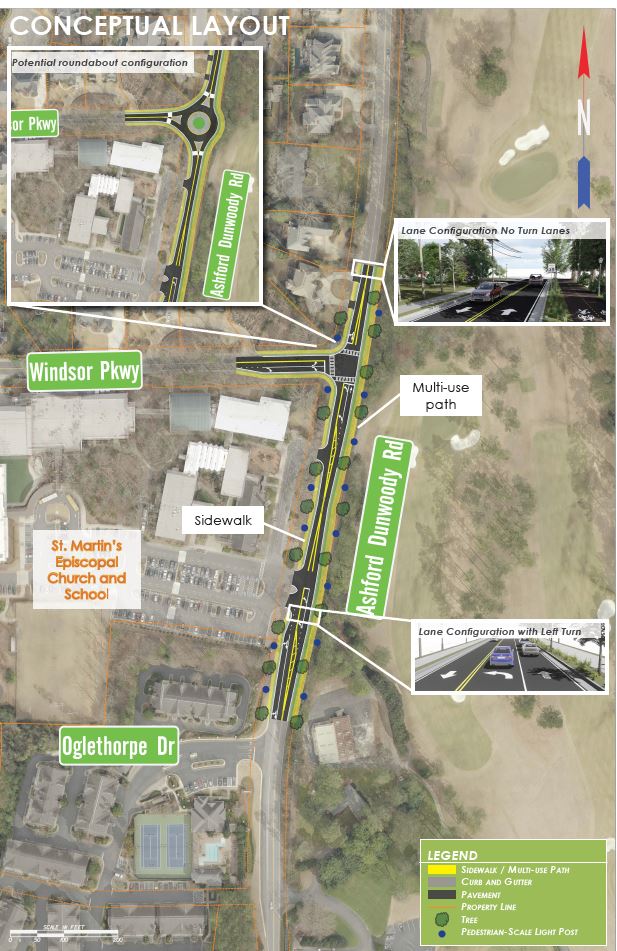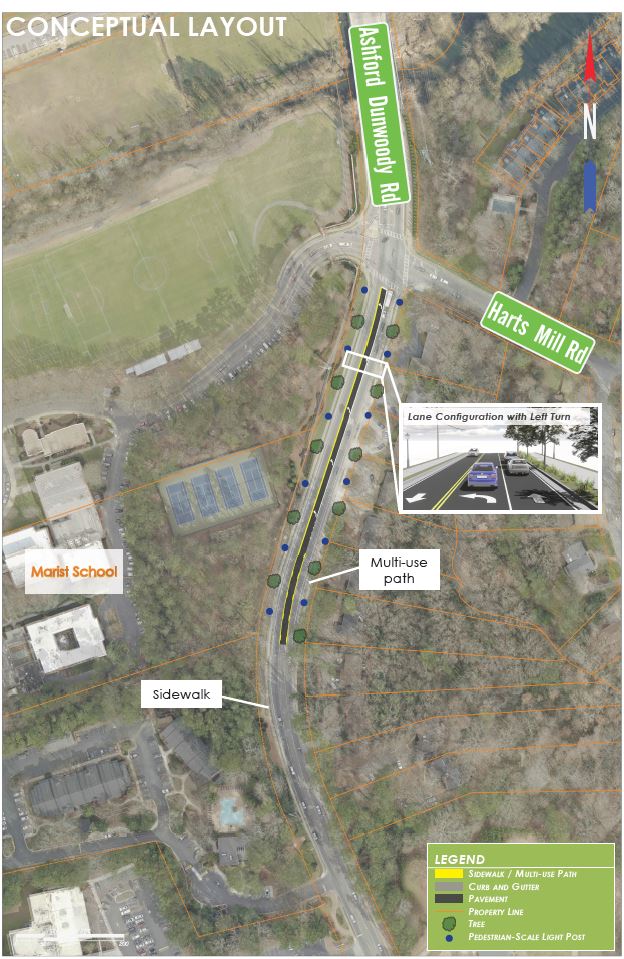 Plans for the intersection of Ashford-Dunwoody and West Nancy Creek include installing left turn lanes on eastbound and westbound West Nancy Creek Drive with left turn arrow signals and utilizing city-owned right-of-way to provide sidewalks, a landscape strip and a multi-use path.