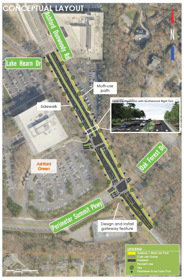 Perimeter Summit Parkway/Oak Forest Road at Ashford-Dunwoody Road. Click to enlarge. 1. Extend the right turn lane on southbound Ashford-Dunwoody Road to north of Ashford Green, creating two southbound through lanes and dedicated right turn lanes into Ashford Green and Perimeter Summit Parkway. Transition to one southbound lane south of the intersection at Perimeter Summit Parkway/Oak Forest