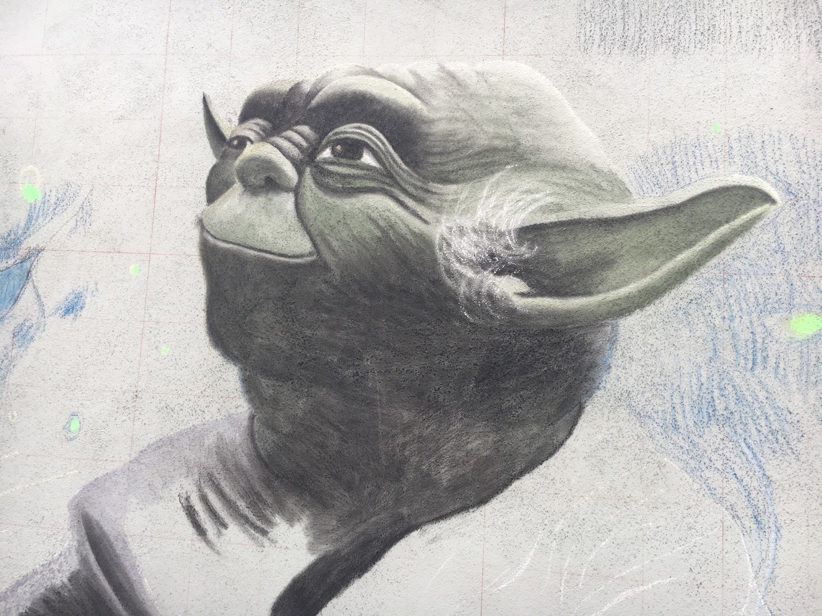 The artworks were created by Rachel Tipton Boyd, Katie Bush, Zach Herndon, Meg Mitchell, Jessie Queen and James Wheeler, who are all members of the Georgia Chalk Artists Guild. Their subjects included the villainous Darth Vader, the large-eared mentor Yoda and the heroic Luke Skywalker.