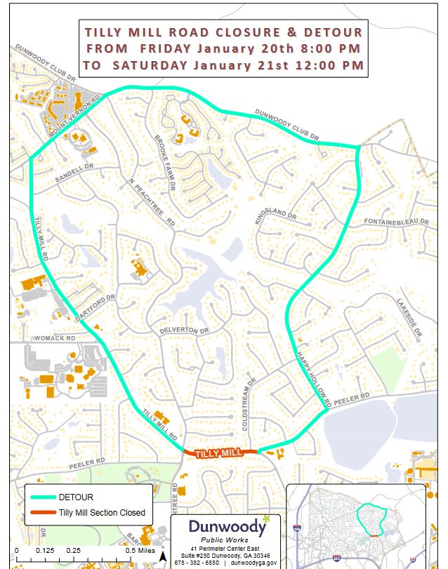 The road closure and detour during this period will begin at the intersection of North Peachtree Road at Tilly Mill Road and extend east to the intersection of Peeler Road at Tilly Mill Road. The road closure and detour will begin at 8 p.m. Friday, Jan. 27, and end Saturday, Jan. 28, at noon. During this period, the detour will re-route traffic north of the road closure utilizing Happy Hollow Road, Dunwoody Club Drive and Tilly Mill Road.