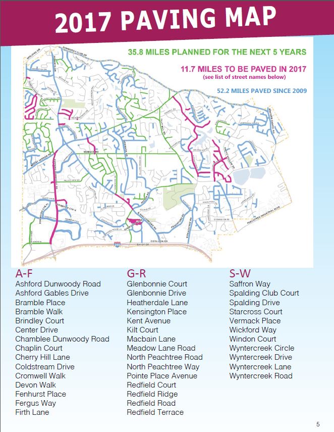 To view a list of the roads being paved in the 2017 city of Dunwoody paving program, visit the 2017 Paving Map on the city website.