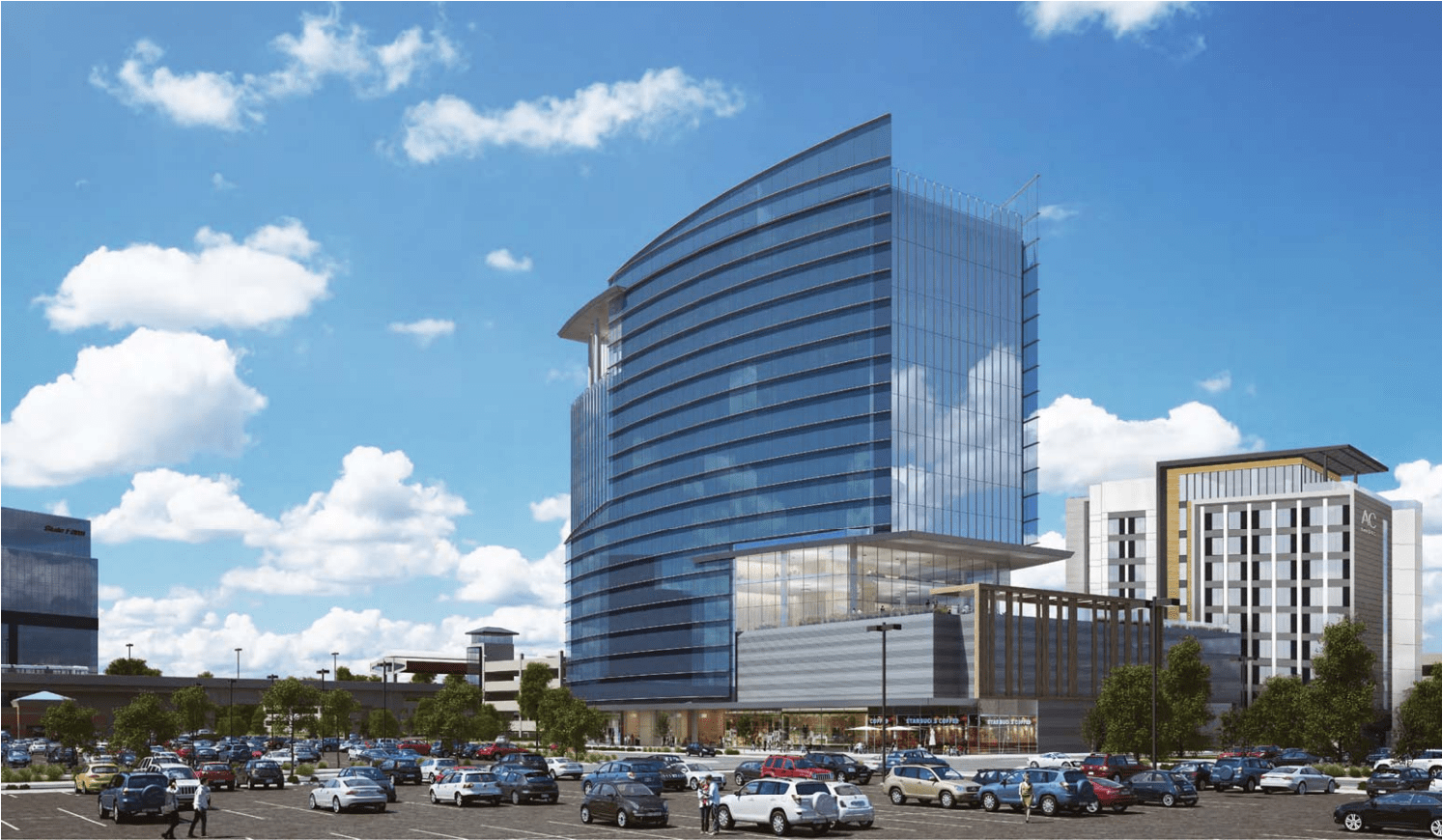 The plan retains Transwestern’s concept of erecting the tower in what is now a surface parking lot along Hammond Drive and buying an existing MARTA parking garage for the tower’s use. The tower and the garage would be connected by an elevated walkway.