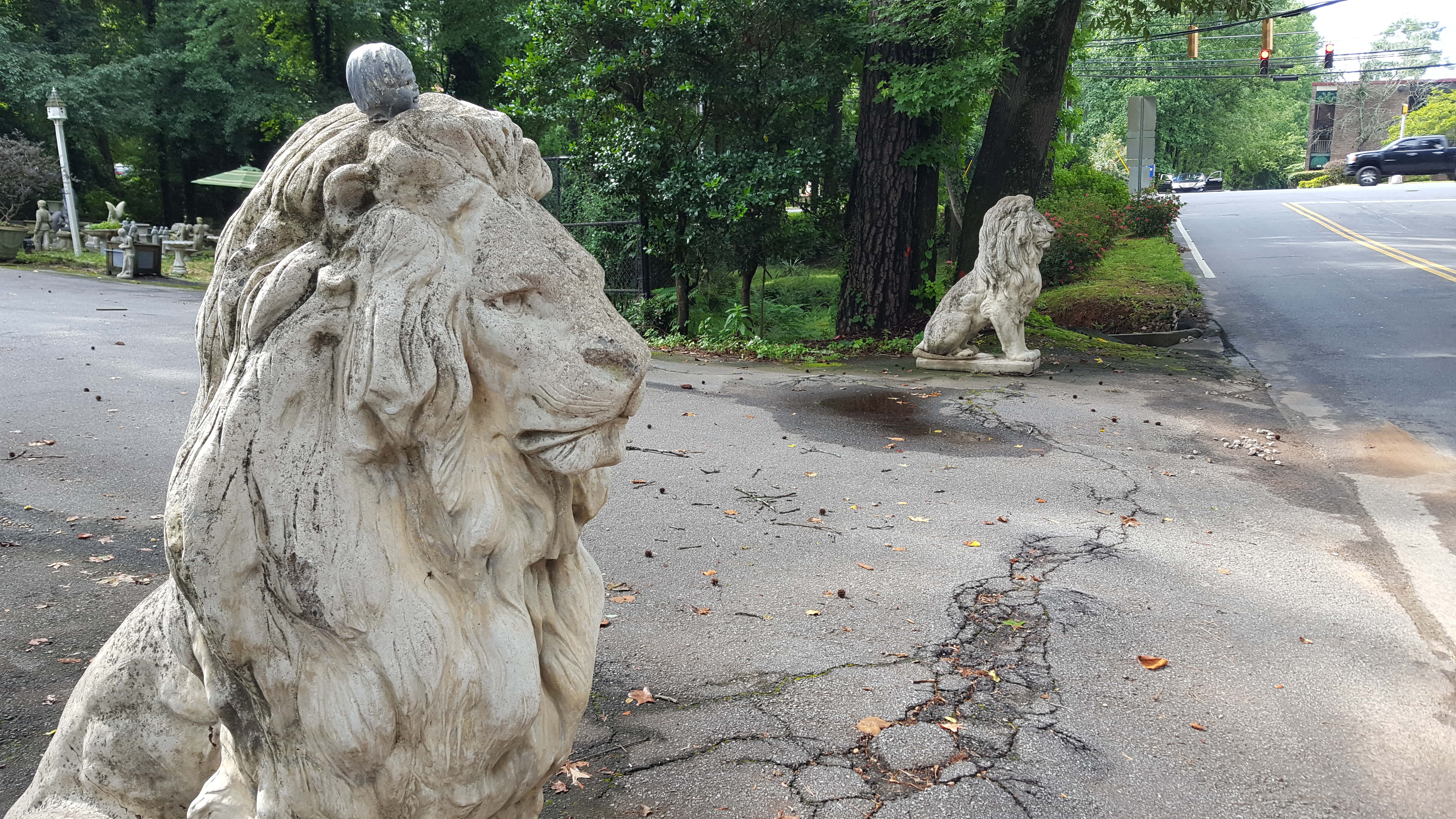 The shop is a memorable sight on Hammond Drive for its yard packed with statues and fountains. A pair of concrete lions, bought from the Country Club of the South in Johns Creek, currently flank the shop’s driveway.