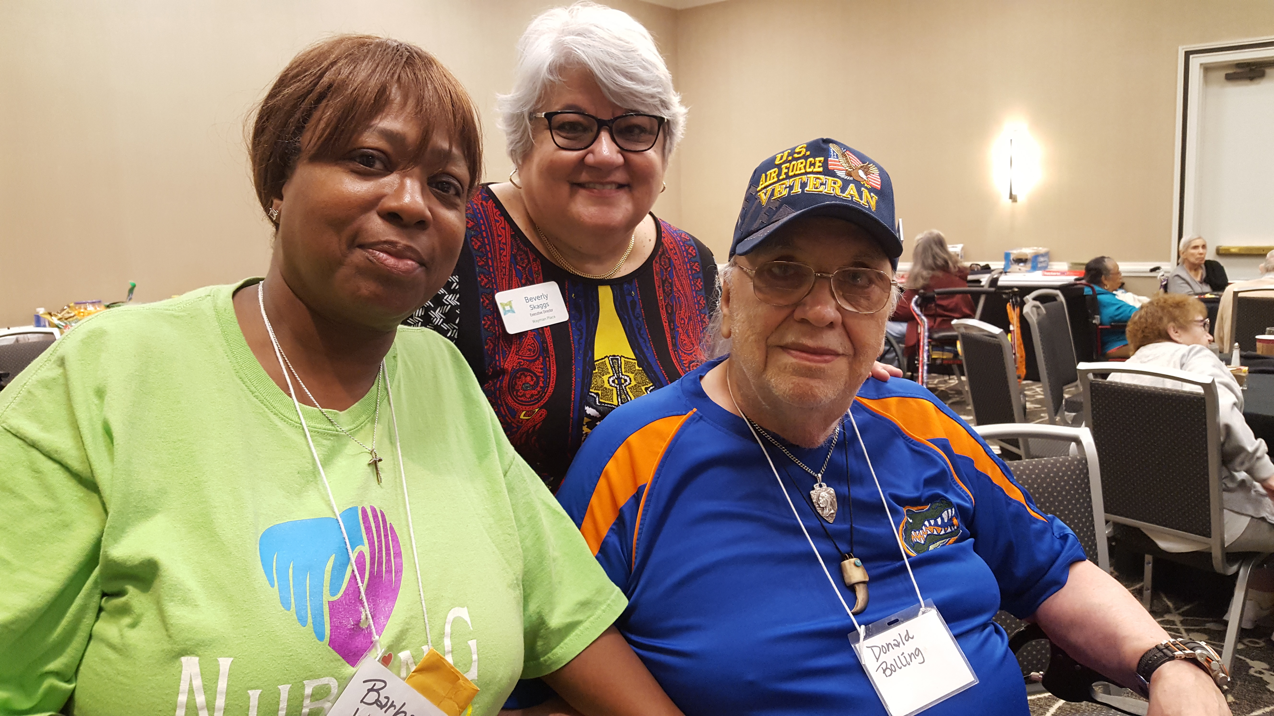 “I love the vacation, but I want to go home,” said Donald Bolling, an evacuee sporting an Air Force veteran ballcap and a Florida Gators shirt, as he sat at one of the tables that had just been squeezed together to make room for another event’s breakfast spread next door.