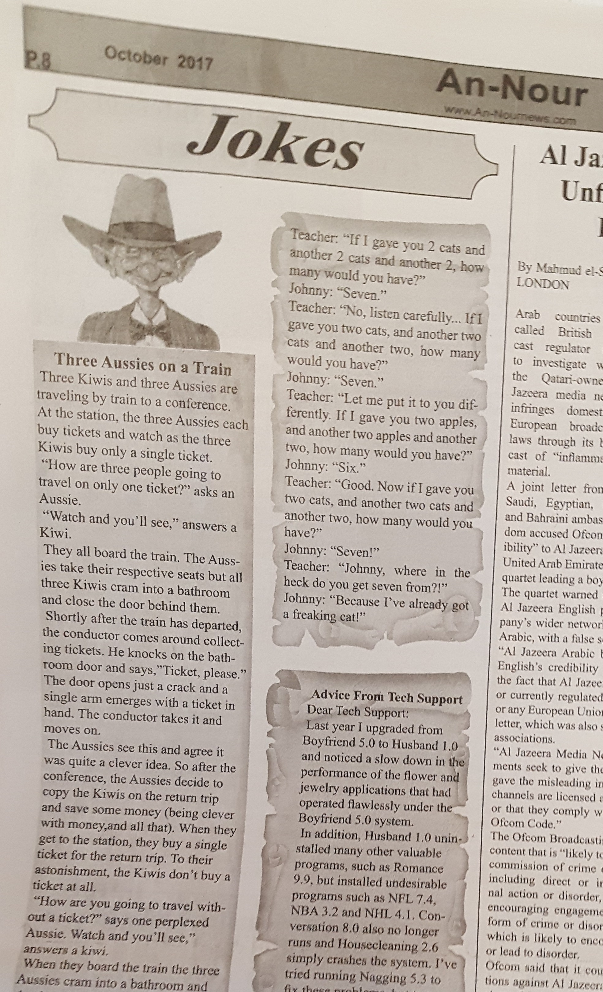 While Osta apologized for the joke, he also said he did not understand what was offensive about it, and noted that every issue of the paper – which has published for 16 years – includes the column of jokes using a wide variety of stereotypes. An-Nour finds the jokes online or gets them from friends and readers, he said.