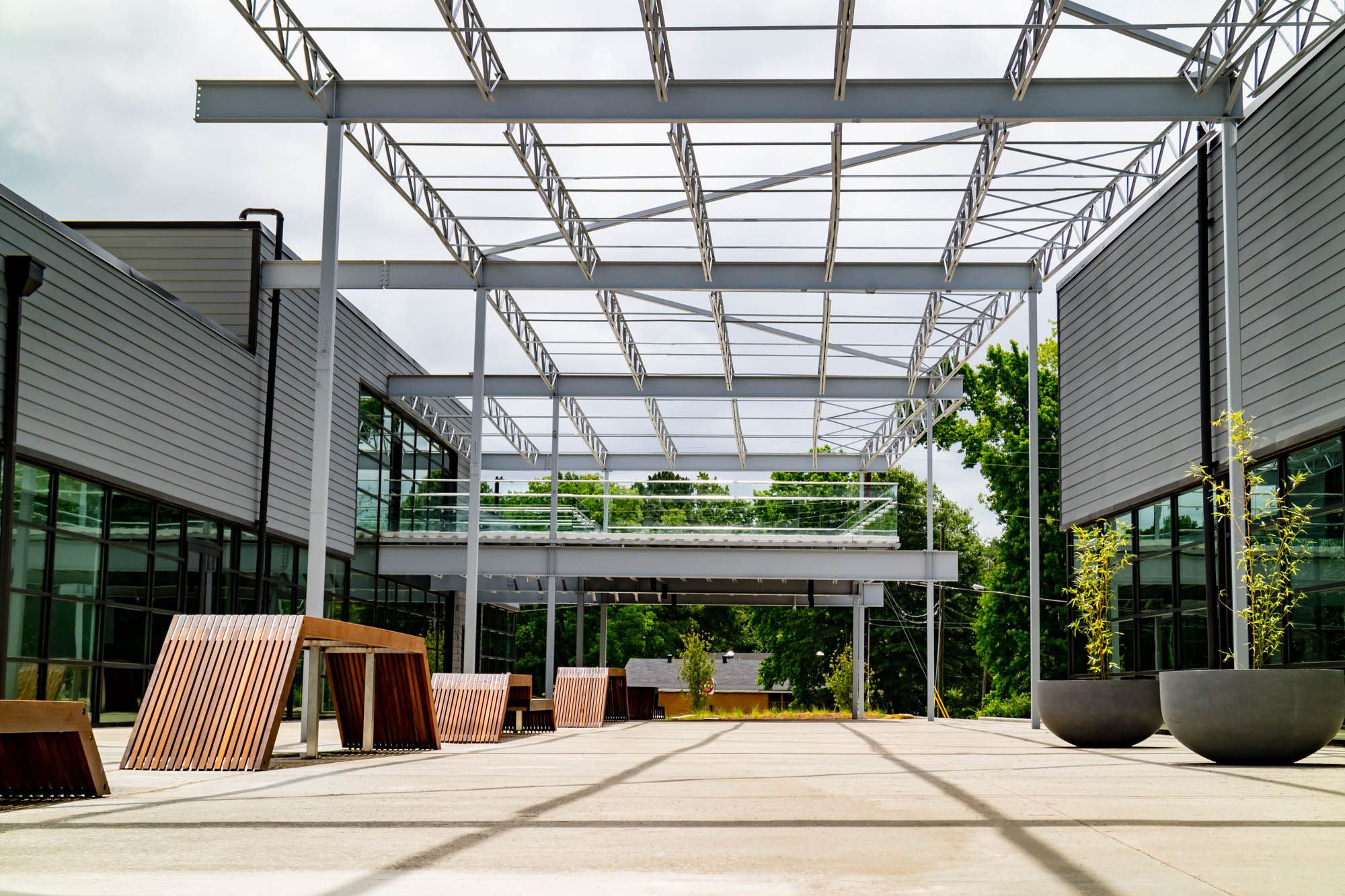 Design of Apple Valley Brookhaven was by architect Perkins + Will and the office complex includes high ceilings, a mezzanine, lots of natural daylight coming in through large windows, garage door openings and a courtyard.