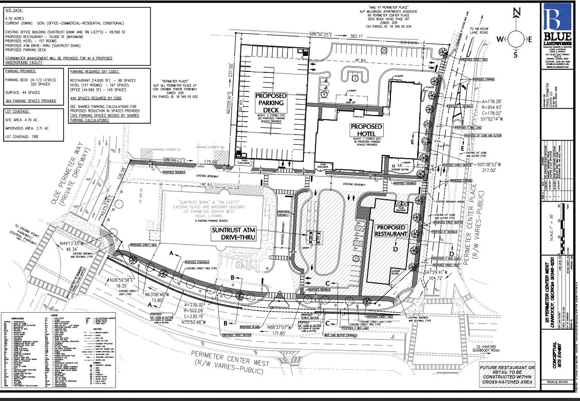 Current zoning of the property allows for two stories. The property is included in the recently approved Perimeter Center Overlay district that allows for up to 16 stories as part of a move to place denser development in a specific area of Perimeter Center. The developer is also seeking SLUPS to vary the streetscape requirements now required in the new zoning district that is intended to be more pedestrian and bike friendly.