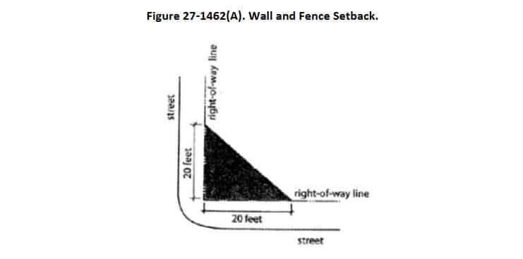 - No wall or fence can be placed or maintained within the triangular area formed at the intersection of a street right-of-way lines as indicated in the illustration.