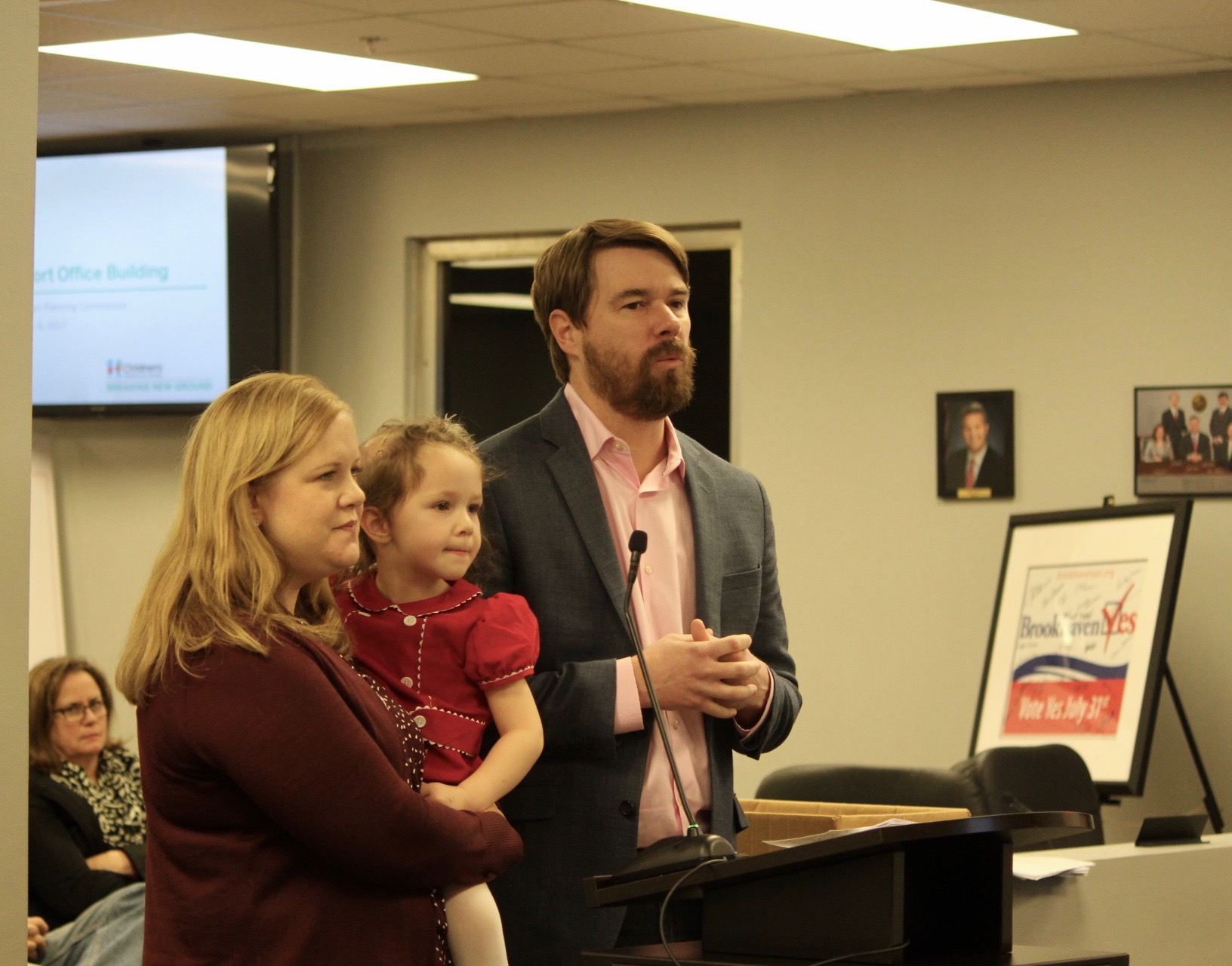 At the Planning Commission meeting, members were introduced to Brookhaven residents, Matthew and Jamie Brewer, and their daughter, Caroline. In February Caroline had brain surgery at CHOA to remove a softball-sized tumor. Her prognosis was dire, Matthew Brewer said, and he and his wife were told if she survived there was a good chance she would be paralyzed and possibly blind. After an 8-hour surgery, however, a nurse brought them to see Caroline, who was waking up and able to say hello to her parents.