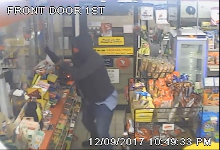 The clerk first fought with the suspect over the gun before backing away and telling the suspect how to enter the cash register. The suspect then reached across the counter and pressed the button to open the cash register, grabbing approximately $4,000 in cash and then running out the same door he entered, according to police.