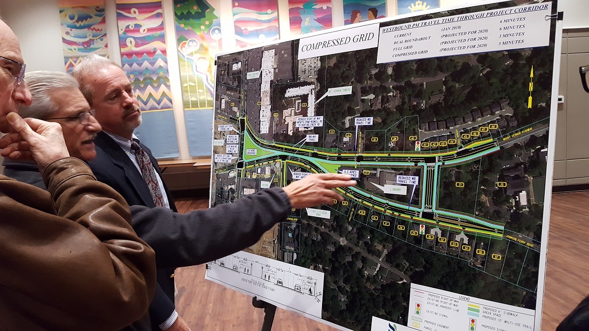 Design options to replace Sandy Springs’ Mount Vernon Highway/Johnson Ferry Road intersection with a new street “grid” or a dual roundabout drew mixed reactions from a crowd at a March 8 community meeting. Coloring many of the opinions was widespread opposition to the grid option’s new four-lane cut-through street that would run through what is now a Sandy Springs Branch Library park.